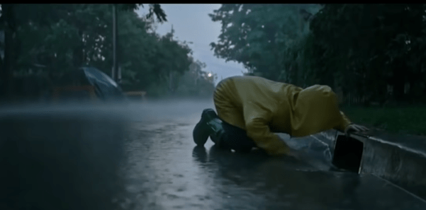 The kid from It movie (2017, Andy Muschetti), the kid’s yellow jacket represents the innocence and ingenuity of a child. It is contrasted with the dark and unsaturated environment that gives the viewer uneasiness and an ominous feeling, preparing the viewer to be scared to the kid that strayed away in the rain.