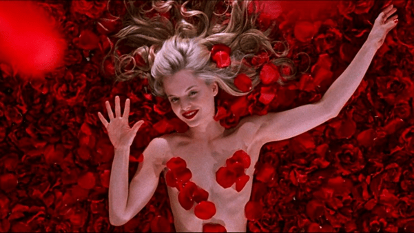 The scene from the well-directed “American Beauty” (1999, Sam Mendes) represents intensity the feeling of love using intense vivid red petals overwhelming the screen.