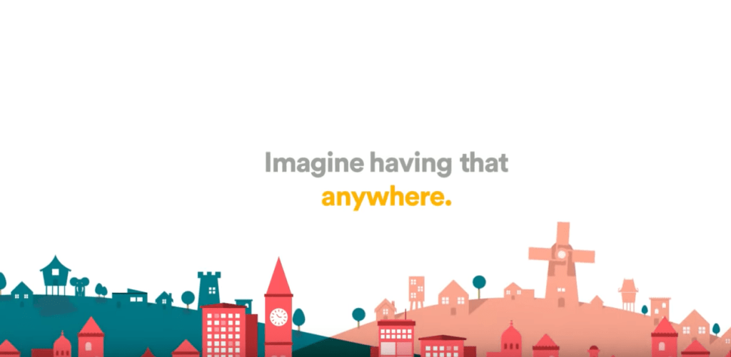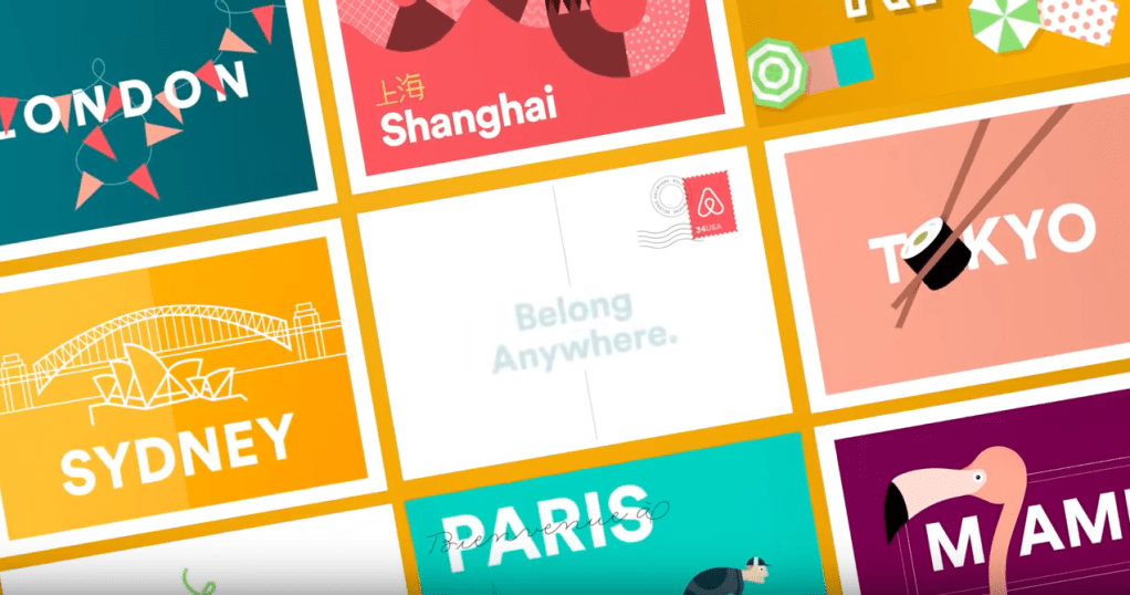 The word anywhere by illustration of different building styles from different parts of the world, a paper plane flying to turn into stamps from different places of the world to demonstrate the global reach of Airbnb.